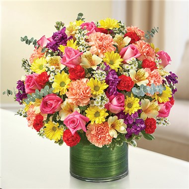 Express your condolences with our truly original sympathy arrangement of bright and beautiful roses, stock, alstroemeria, carnations and more. Designed by our florists to offer comfort to friends and family during difficult times of loss.• Graceful, bright-toned arrangement of roses, stock, alstroemeria, carnations, daisy poms, mini carnations and monte casino, gathered with variegated pittosporum and spiral eucalyptus• Hand-designed by our expert florists in a stylish clear glass cylinder vase wrapped with a Ti leaf ribbon; vase measures 6"H• Appropriate for the service or the home of friends and family members • Large arrangement measures approximately 16"H x 17"L• Medium arrangement measures approximately 15"H x 16"L• Small arrangement measures approximately 14"H X 15"L• Our florists hand-design each arrangement, so colors, varieties, and vase may vary due to local availability